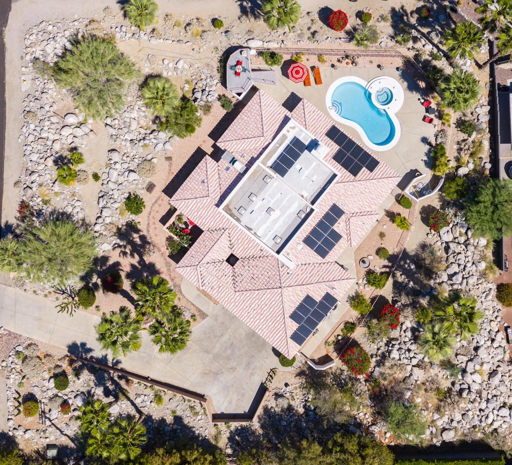 High above Palm Springs, this exceptional 3-bedroom, 3-bathroom estate-like residence on an 1/2 acre lot commands breathtaking 360-degree views of the entire valley floor and beyond. Take advantage of this rare opportunity to join a truly unique neighborhood with investment potential, where you find new and old custom built single family homes side by side.Owing to its custom build, the layout is thoughtful, with a grand entrance opening to the living room showcasing a custom fireplace. The kitchen delivers generous prep space, bar seating, a spacious walk-in pantry, and a cozy breakfast area for four, with an adjacent den that could easily serve as a 4th bedroom. Each bedroom has access to an outdoor patio space, with the primary leading directly to the pool area and on the front of the house, one of two guest bedrooms has its own entrance, kitchenette and en suite bath, ideally suited as a guest house.The outdoor experience includes a covered patio, sparkling tiled pool, spa, and a raised deck all with the phenomenal valley as your backdrop. Leased solar panels With undeniable renovation potential, property represents is a compelling investment. 30-Panels Solar system and Short Term Rental Permit availability. Furniture available outside of escrow per Seller inventory. Rare 3-Car Garage and expansive driveways for multiple cars. Fee simple (You Own the Land).
