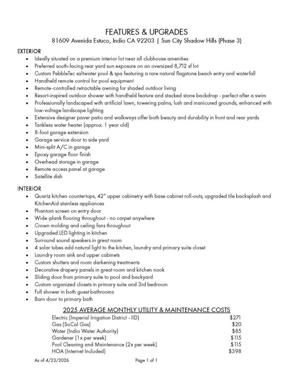 Experience elevated desert living in this beautifully upgraded, move-in ready home designed for effortless indoor-outdoor living. From the moment you arrive, the extensive custom paver hardscaping set the tone for a low-maintenance yet highly refined outdoor environment.The backyard is a true private retreat, showcasing a resort-style saltwater pool and spa with a stunning flagstone beach entry-creating a rare, resort-inspired setting perfect for both relaxation and entertaining. An outdoor shower with handheld fixture, set against a striking stacked-stone wall, adds a spa-like touch, while professionally designed landscaping features 14 towering palm trees, citrus trees including Meyer lemon and lime, and ambient lighting for magical desert evenings. A remote-controlled retractable awning provides shaded comfort, allowing you to enjoy the space year-round. Inside, the home is thoughtfully upgraded for both comfort and style, featuring wide-plank laminate flooring throughout (no carpet), crown molding, LED recessed lighting and surround sound speakers in the great room. Natural light fills the home through well-placed solar tubes in the kitchen, laundry and primary closet, enhancing the bright and welcoming atmosphere.The kitchen is designed to impress with quartz counters, full-height 42-inch cabinetry, an upgraded tile backsplash, and stainless steel KitchenAid appliances-perfectly blending functionality with modern design.The primary suite offers a peaceful retreat with a sliding glass door providing direct access to the pool and backyard, along with a barn door entry to the en-suite bath. Additional features include custom wood shutters, room-darkening window treatments and ceiling fans throughout.Practical upgrades provide peace of mind, including a newer Lennox HVAC system (approx. 2 years old), a tankless water heater (approx. 1 year old), and a mini-split system in the garage-ideal for added comfort and flexibility. The garage is equally well appointed with epoxy finished flooring and overhead storage.This home seamlessly combines modern upgrades, energy efficiency and a resort-style outdoor living-offering the ultimate desert lifestyle. Residents of Sun City Shadow Hills enjoy resort-style amenities including golf, clubhouses, fitness centers, pools, tennis, pickleball, dining, and a vibrant social lifestyle--all with low HOA dues.''