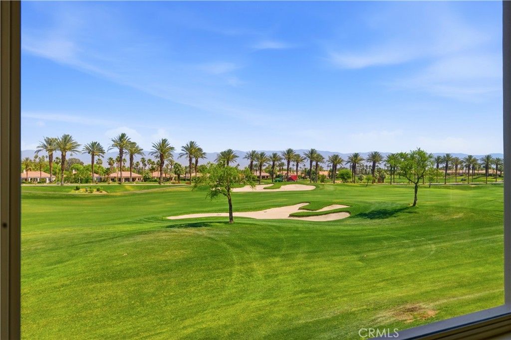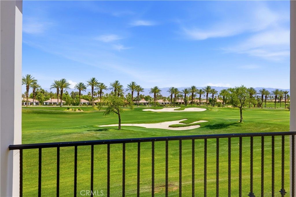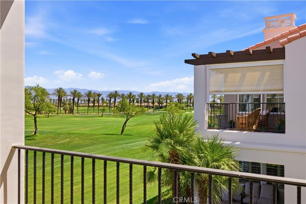 Enjoy elevated desert living in this upper-level, north-facing condo overlooking Hole 9 of the Palmer 18-hole golf course. With ground-level entry to a second-floor residence, this home offers both privacy and convenience. The living room features a cozy fireplace and opens to expansive outdoor areas with panoramic views of Fairways 8 and 9, framed by the Shadow Hills.