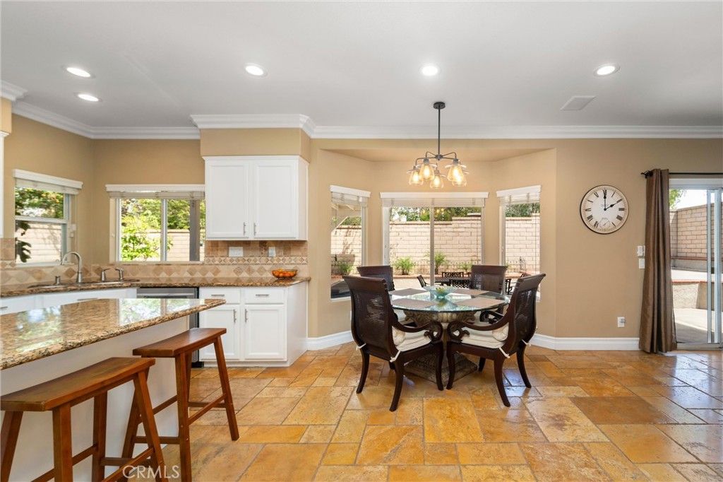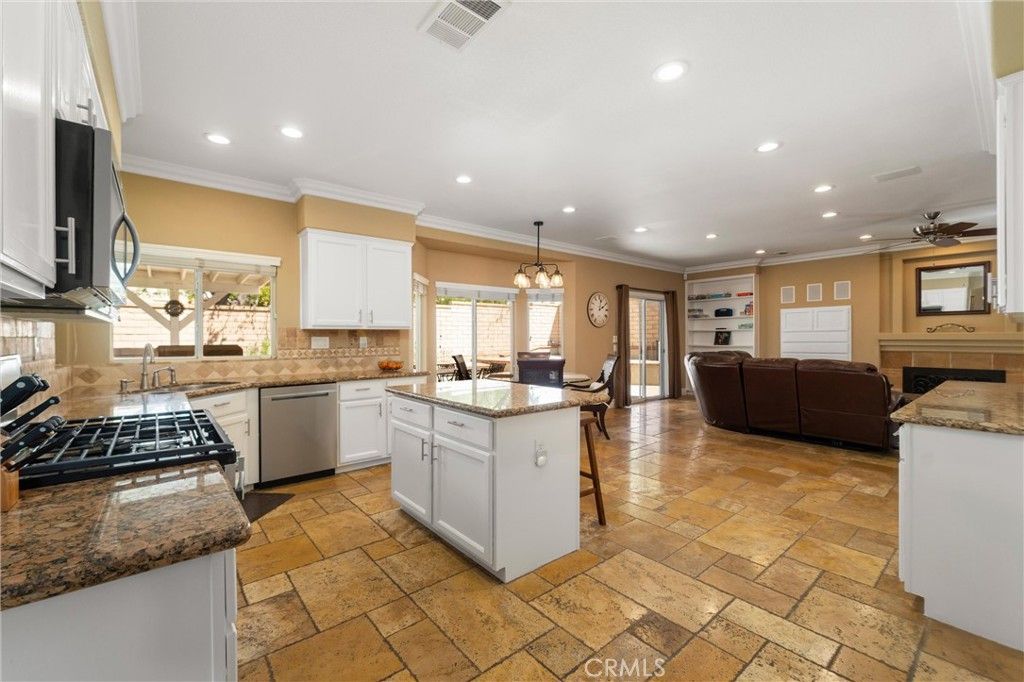 The family room centers on a stone-surround fireplace with built-in display niches and opens directly into the kitchen, which is finished with granite counters, white cabinetry, stainless-steel appliances, a tumbled-stone backsplash, and a center island with seating. A walk-in pantry sits behind an etched-glass door, and a bay-window breakfast nook overlooks the yard.