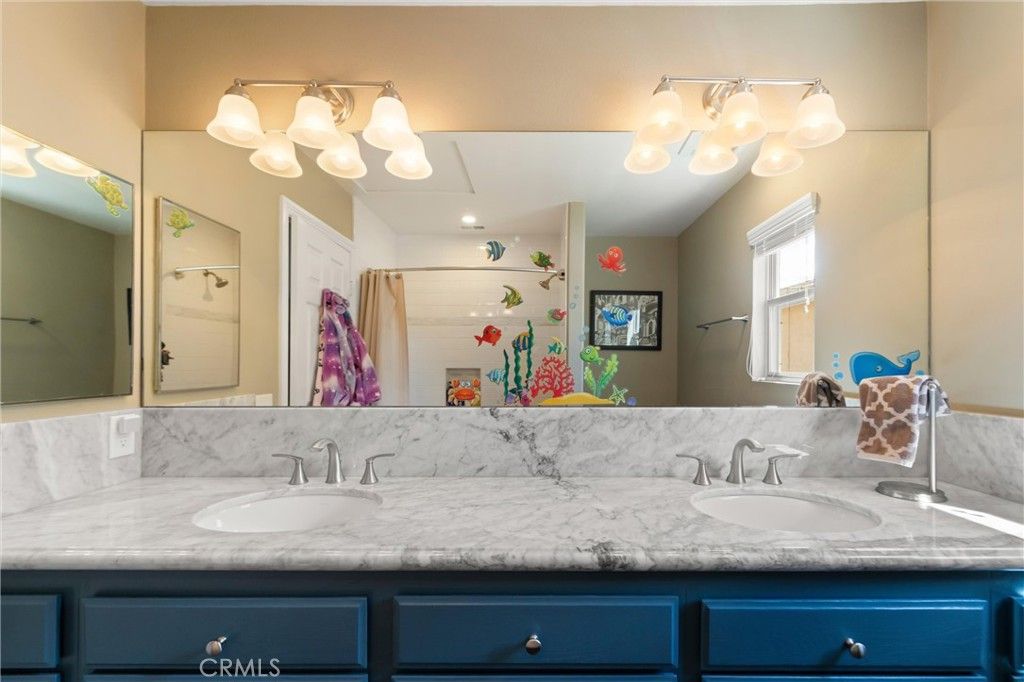 Upstairs, the primary suite features high ceilings and neighborhood/mountain views, with an en-suite bath finished in marble counters, a deep soaking tub, a frameless-glass walk-in shower, and dual walk-in closets. Connected by an open air balcony/hallway, three additional bedrooms and a full bathroom complete the spacious upstairs living space.