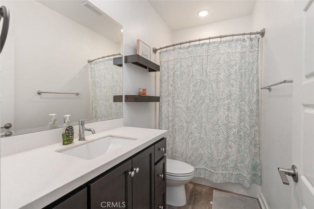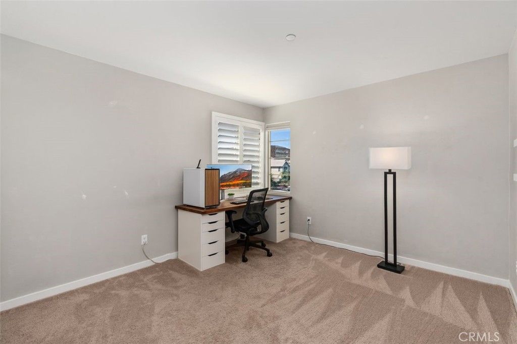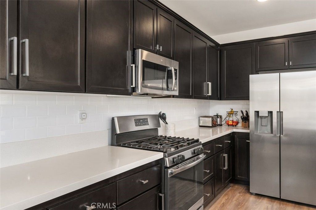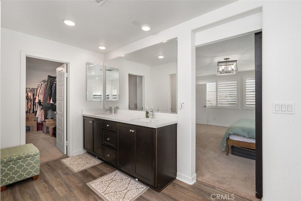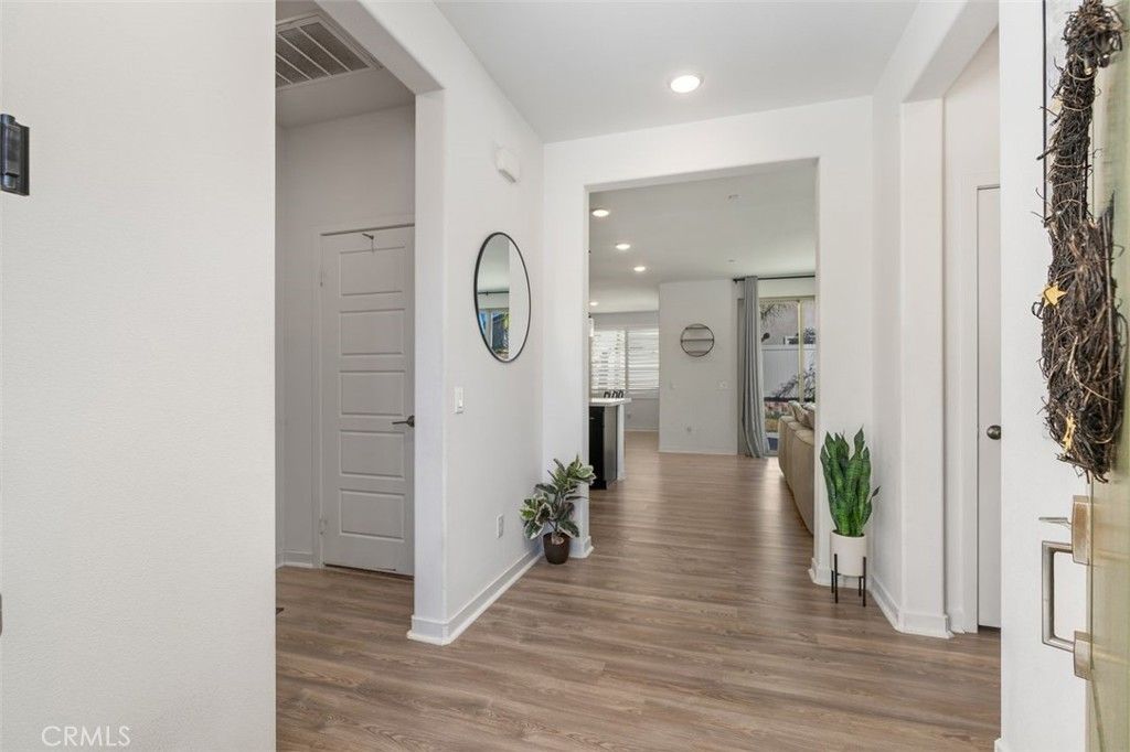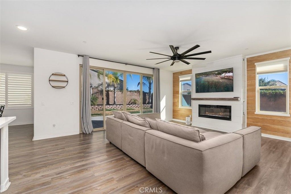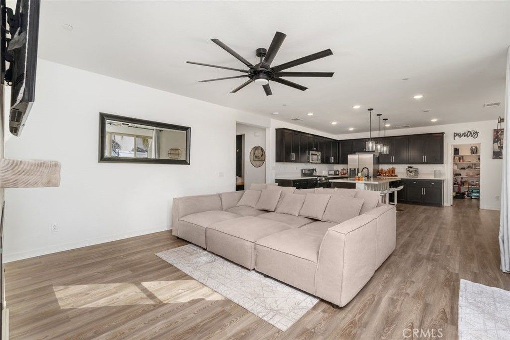 This approximately 2,650 square foot house offers four bedrooms and three bathrooms in the Centennial Community of Menifee. The open floor plan provides a welcoming and versatile layout. The chef's kitchen features quartz countertops, a walk-in pantry, and stainless steel appliances, creating an ideal space for culinary enthusiasts. The living area showcases wood paneling and built-in features, adding a touch of warmth and character.