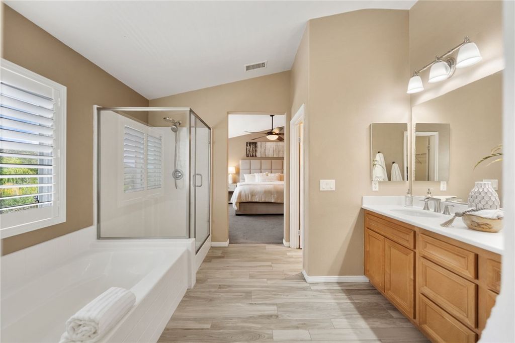 Welcome to Paper Bark Ave., a beautifully appointed, extensively upgraded residence set on a SINGLE-LOADED street w/in the prestigious GUARD-GATED community of Greer Ranch. Showcasing a significant investment in quality enhancements & ENERGY-EFFICIENT systems, this home offers an exceptional blend of refined living, privacy, & modern comfort. Striking curb appeal sets the stage w/manicured landscaping, vibrant accents, & illuminated entry steps leading to a stunning glass leaded front door. Inside, soaring ceilings & luxury vinyl plank flooring create an elegant yet inviting ambiance. Formal living & dining spaces are filled w/natural light, w/the dining rm featuring a custom door for seamless indoor-outdoor flow. The fully REMODELED KITCHEN is the heart of the home, designed w/white cabinetry, an expansive island, quartz counters, tile backsplash, & SS appl., all opening to the inviting family rm w/fireplace, custom built-ins, & ceiling fan. The main level also features a flexible rm w/double door entry, ideal as a 5th BR or office, along w/a nearby full BA. Upstairs, 3 secondary BR offer mirrored wardrobes & ceiling fans, along w/a full secondary BA, + a laundry rm w/sink & storage. The primary suite is a true retreat, capturing scenic views through large picturesque windows w/plantation shutters. The primary BA features a soaking tub, walk-in shower, dual vanities, & a spacious walk-in closet. Designed for efficiency & comfort, the home incl. OWNED SOLAR to SAVE you $$$, newer dual high-efficiency A/C systems (approx. $68K), upgraded insulation & ducting, + a whole house water filtration system. Additional enhancements include crown molding, upgraded baseboards, a security camera system, & a custom generator setup. Step outside to your private backyard oasis, where a covered patio offers the perfect place to relax or entertain year-round. Just beyond, a beautifully designed freeform POOL takes center stage, complemented by a RAISED SPA wrapped in stacked stone & a tranquil spillway cascading into the pool. Surrounded by lush palms, mature landscaping, & a curved stone retaining wall, the space offers both privacy & a peaceful hillside backdrop. Multiple seating areas & an expansive patio make this yard ideal for relaxing or entertaining. Residents of Greer Ranch enjoy guard-gated security, parks, community events, hiking trails & a prime location near top-rated schools, shopping, dining, Temecula wineries, & Old Town Murrieta.