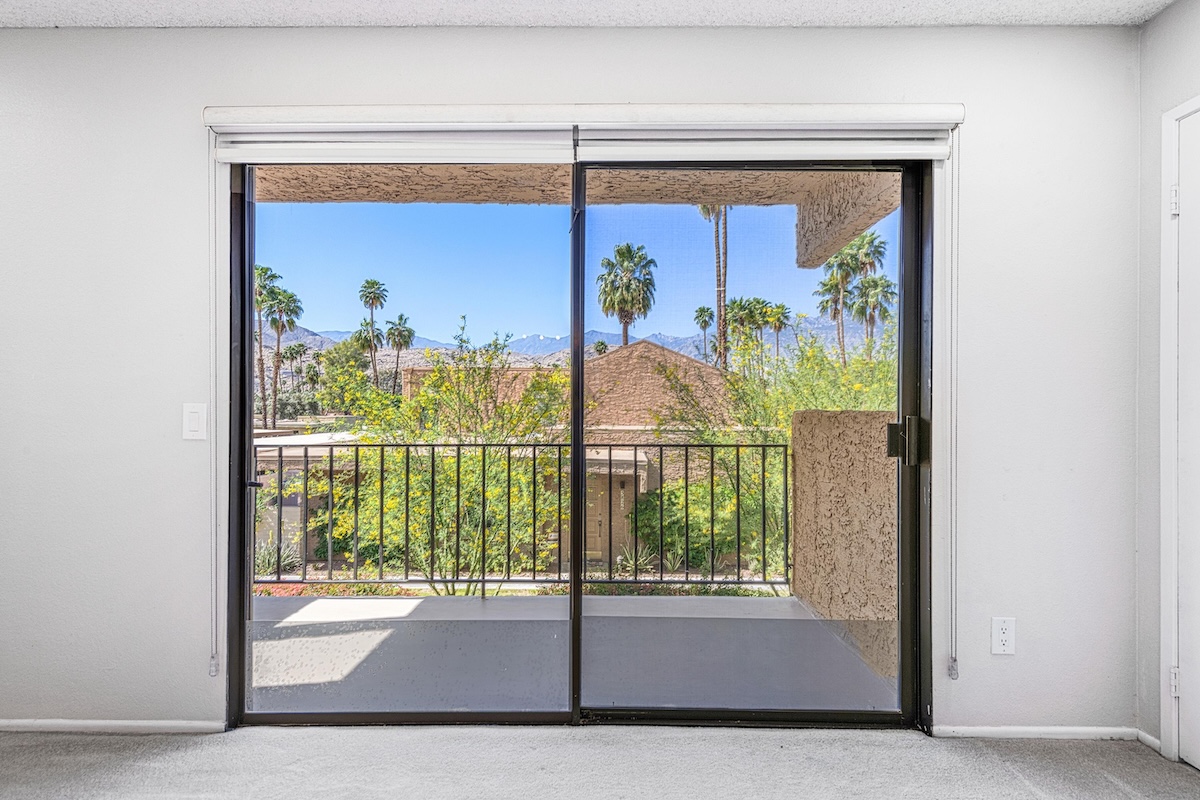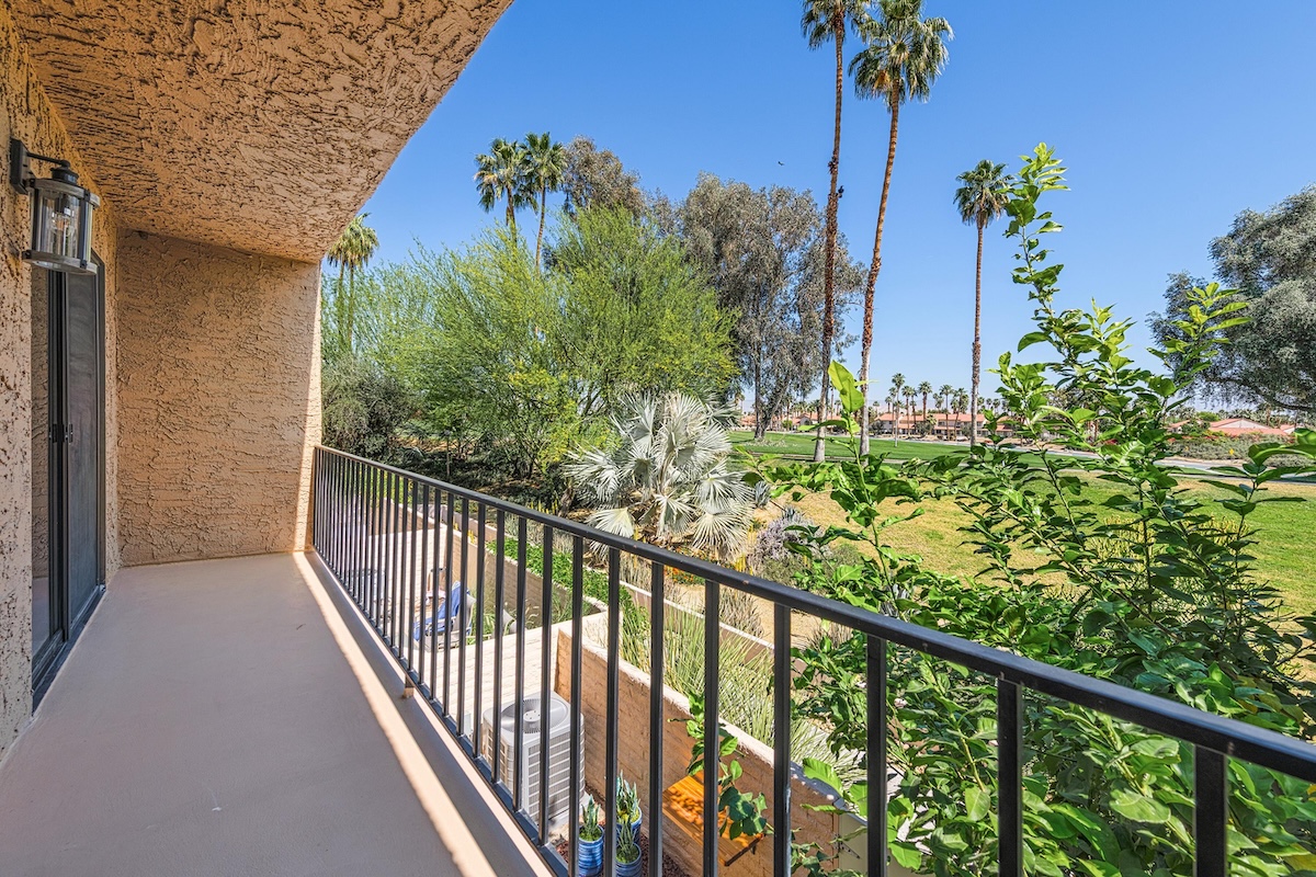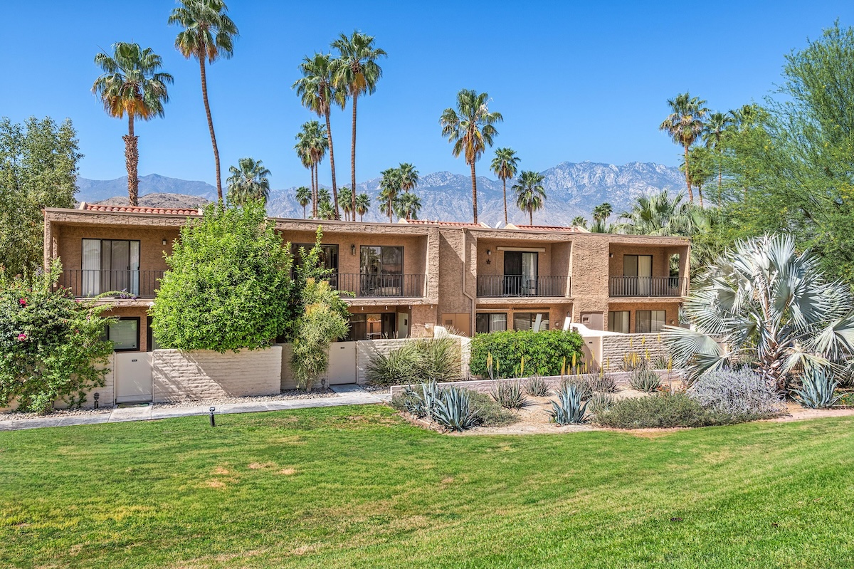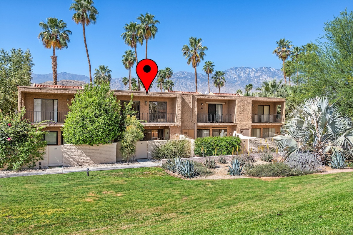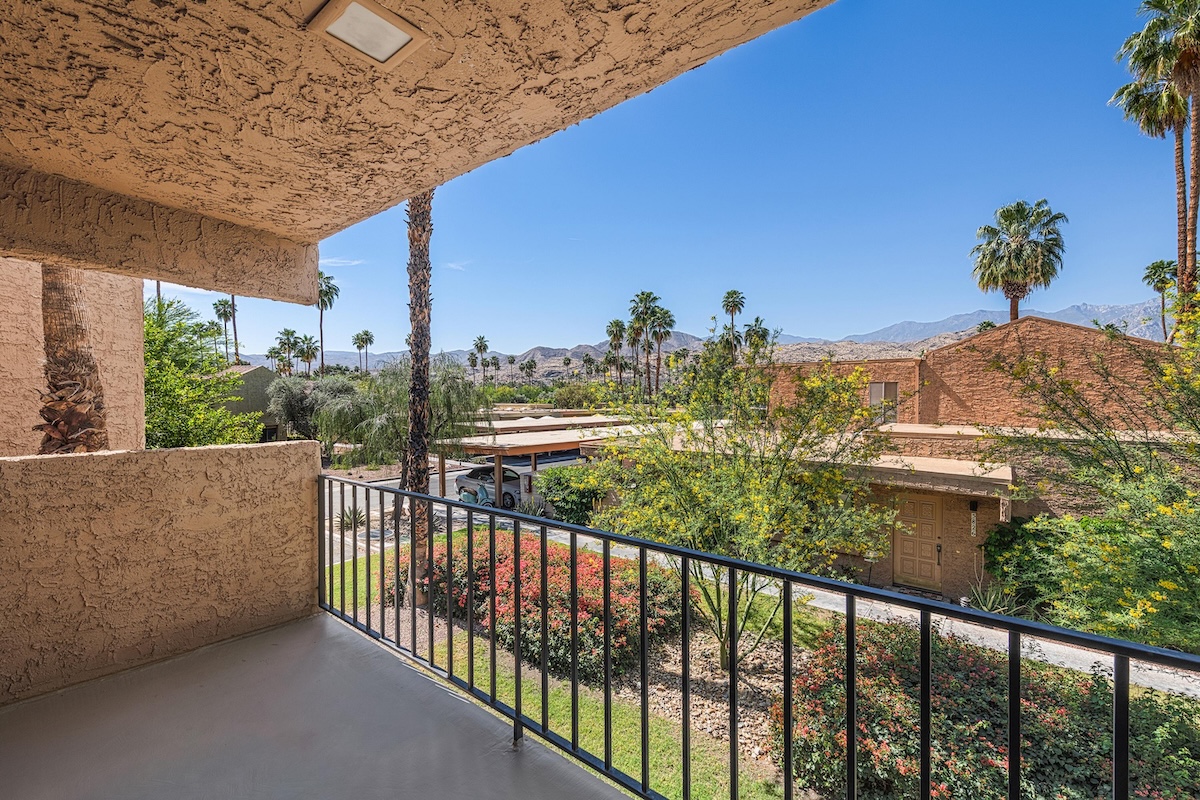 Welcome to Villas de Las Flores — with one of the few 3-bed, 3-bath condos that’s ready for its next chapter as your perfect desert retreat. Major updates have already been taken care of, including a new air conditioning system, updated electrical panel, new switches, plugs, and recessed lighting throughout. Mountain views greet you from the front patio and balcony, while the two secondary bedrooms share a balcony overlooking the golf course — a pretty great spot to start any morning. The spacious back patio opens directly to walking paths, making it equally ideal for a quiet evening or a lively get-together. Inside, the main level features distinct living, dining, and kitchen areas, along with a ¾ bath and in-unit laundry. Upstairs, all three bedrooms have their own views — including a primary suite with a private front-facing balcony and ensuite bath. Everyone deserves a view, and here, no one misses out. Parking is a breeze with a close assigned spot and plenty of guest parking nearby. You’re also just minutes from Trader Joe’s, Target, Vons, great dining, and world-class hiking trails. The HOA covers water, trash, 11 pools (including one conveniently close by), 2 spas, a fitness room, tennis & pickleball courts, and allows rentals with a 14-day minimum stay. All that’s missing is your personal touch.