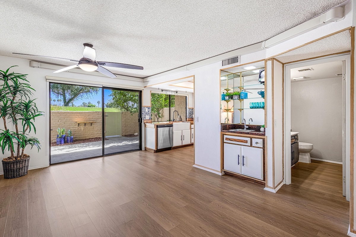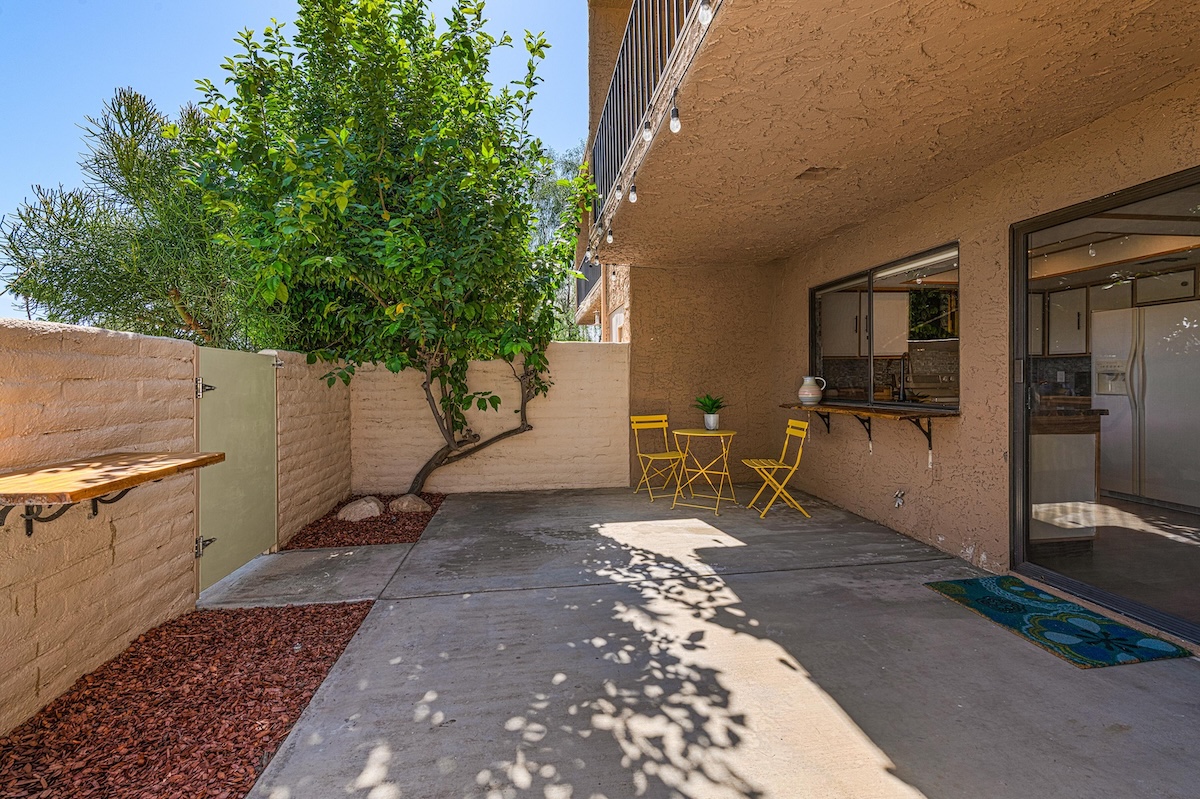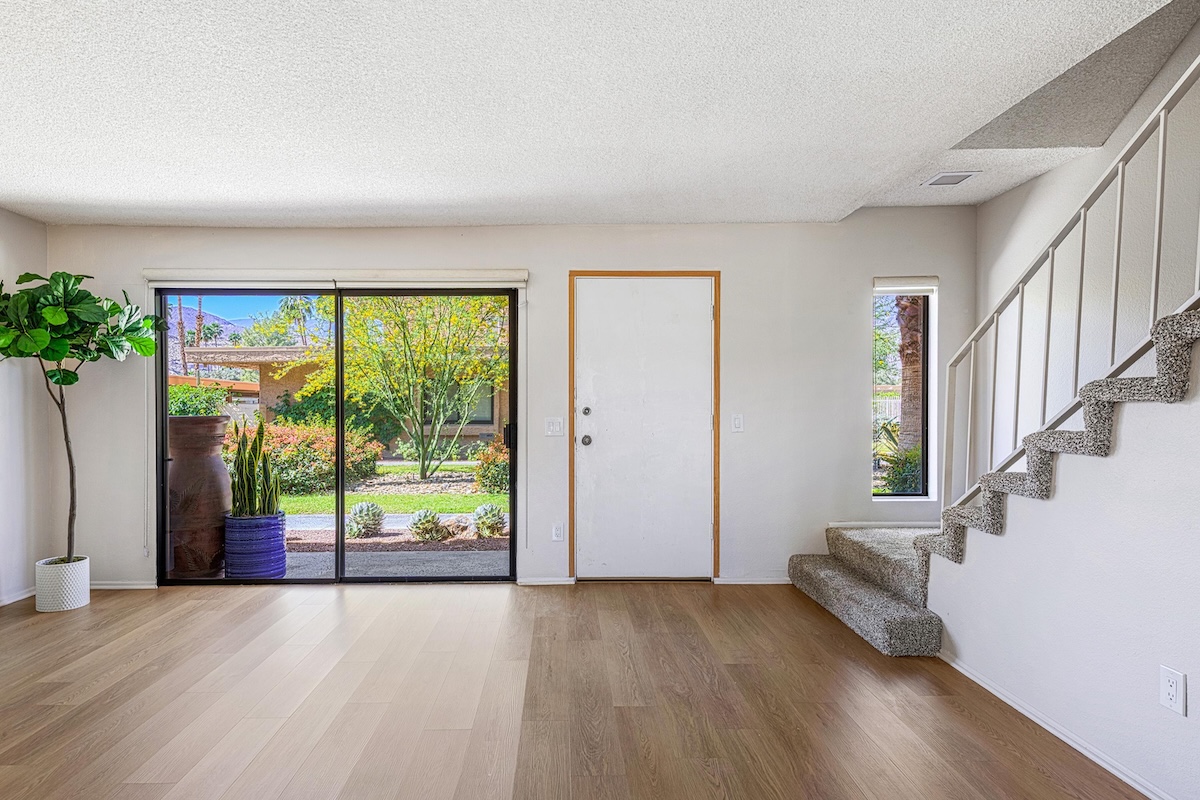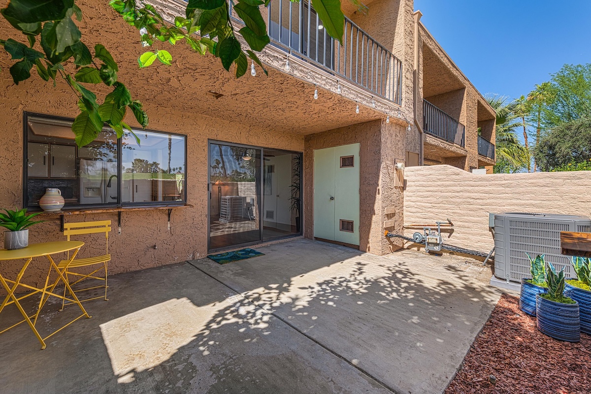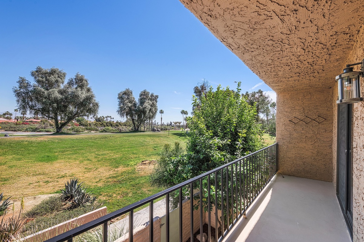 Welcome to Villas de Las Flores — with one of the few 3-bed, 3-bath condos that’s ready for its next chapter as your perfect desert retreat. Major updates have already been taken care of, including a new air conditioning system, updated electrical panel, new switches, plugs, and recessed lighting throughout. Mountain views greet you from the front patio and balcony, while the two secondary bedrooms share a balcony overlooking the golf course — a pretty great spot to start any morning. The spacious back patio opens directly to walking paths, making it equally ideal for a quiet evening or a lively get-together. Inside, the main level features distinct living, dining, and kitchen areas, along with a ¾ bath and in-unit laundry. Upstairs, all three bedrooms have their own views — including a primary suite with a private front-facing balcony and ensuite bath. Everyone deserves a view, and here, no one misses out. Parking is a breeze with a close assigned spot and plenty of guest parking nearby. You’re also just minutes from Trader Joe’s, Target, Vons, great dining, and world-class hiking trails. The HOA covers water, trash, 11 pools (including one conveniently close by), 2 spas, a fitness room, tennis & pickleball courts, and allows rentals with a 14-day minimum stay. All that’s missing is your personal touch.